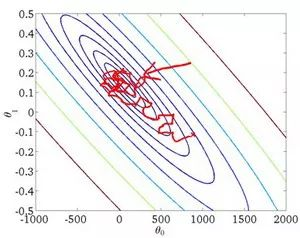 相反,在随机梯度下降法中,从某一点开始,我们重新选取一个起始点,每次迭代,你只对一个样本进行梯度下降,大部分时候你向着全局最小值靠近,有时候你会远离最小值,因为那个样本恰好给你指的方向不对,因此随机梯度下降法是有很多噪声的,平均来看,它最终会靠近最小值,不过有时候也会方向错误,因为随机梯度下降法永远不会收敛,而是会一直在最小值附近波动,但它并不会在达到最小值并停留在此。