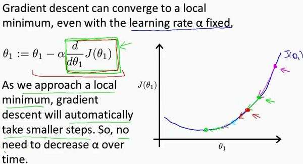 回顾一下,在梯度下降法中,当我们接近局部最低点时,梯度下降法会自动采取更小的幅度,这是因为当我们接近局部最低点时,很显然在局部最低时导数等于零,所以当我们接近局部最低时,导数值会自动变得越来越小,所以梯度下降将自动采取较小的幅度,这就是梯度下降的做法。所以实际上没有必要再另外减小。