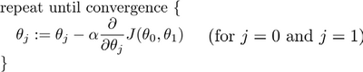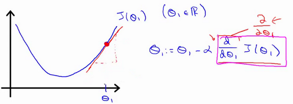 其中是学习率(learning rate),它决定了我们沿着能让代价函数下降程度最大的方向向下迈出的步子有多大,在批量梯度下降中,我们每一次都同时让所有的参数减去学习速率乘以代价函数的导数。