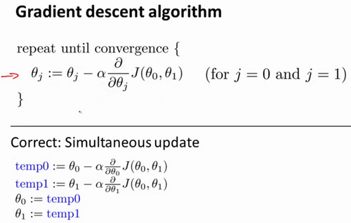 在梯度下降算法中,这是正确实现同时更新的方法。这里不打算解释为什么你需要同时更新,同时更新是梯度下降中的一种常用方法。我们之后会讲到,同步更新是更自然的实现方法。当人们谈到梯度下降时,他们的意思就是同步更新。