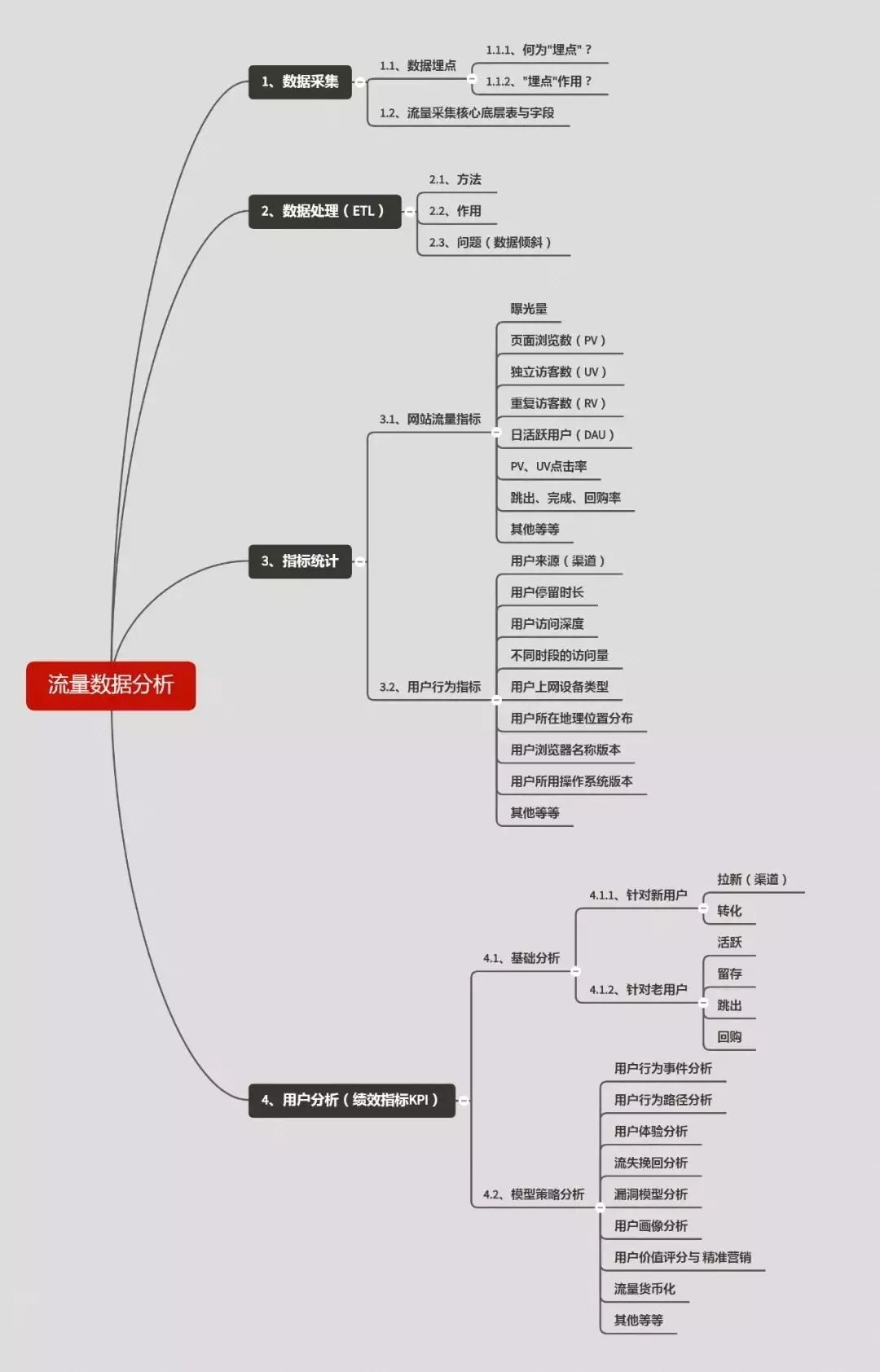 这部分可以从“人人都是产品经理”社区、增长黑客等内容学习,你最少要知道Pv、Uv、DAU等各种指标,如何进行指标拆解、如何进行流量分析、留存分析、用户行为分析,啥是海盗模型,RFM模型、某个指标下降/上升如何分析等等。宝器之前做流量分析的时候会做一个这样框架图,其他的也可参考: