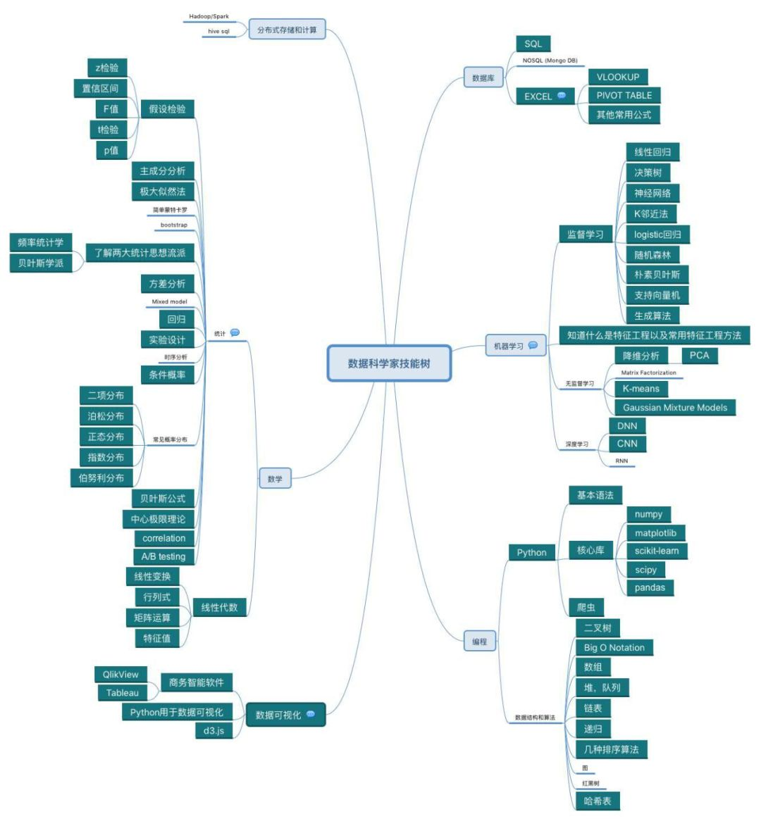 第二部分是推断性统计,你最少要知道中心极限定理、大数定律、置信区间、假设检验、t检验、f检验、卡方检验、ABtest等等。(面试考这一部分较多)可参考这篇文章: