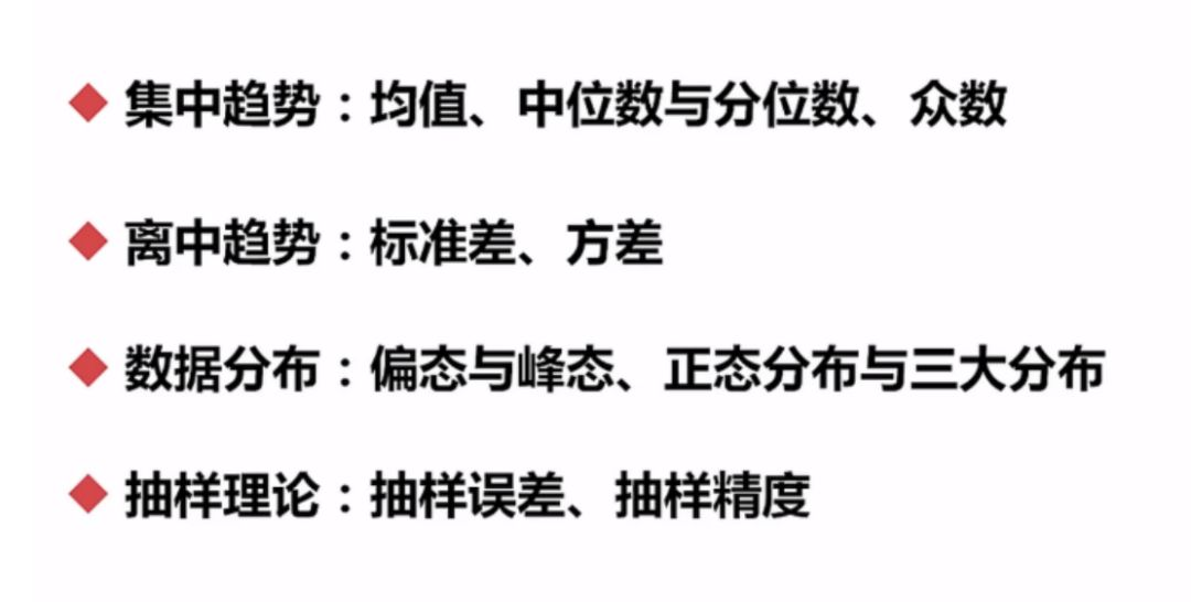 统计学可分两部分学习,第一部分是描述性统计,分别要掌握以下知识点: