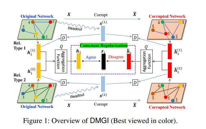 网络中的节点通过多种关系连接。但是,大多数现有的网络嵌入方法都假定节点之间仅存在一种类型的关系。即使考虑了网络的复用性的人,它们也忽略了节点属性,如节点标签,并且无法为图形的全局属性建模。文章提出了一种称为DMGI的属性复用网络,一种简单而有效的无监督网络嵌入方法,该方法受Deep Graph Infomax(DGI)的启发, 最大化图的局部信息和整个图的全局表示之间的相互信息。文章设计了一种系统的方法,通过引入以下方法来联合集成来自多个图的节点嵌入:1)consensus regularization框架,该框架最小化关系类型特定节点嵌入之间的分歧,2)通用标识符,用于区分真实样本,而与关系类型无关。文章还表明,注意力机制可以推断每种关系类型的重要性,因此可以作为预处理步骤用于过滤不必要的关系类型。在各种下游任务上进行的大量实验表明,即使完全没有DMGI的监督,DMGI的。