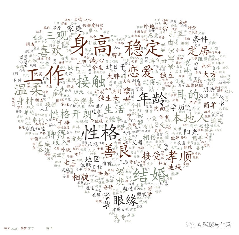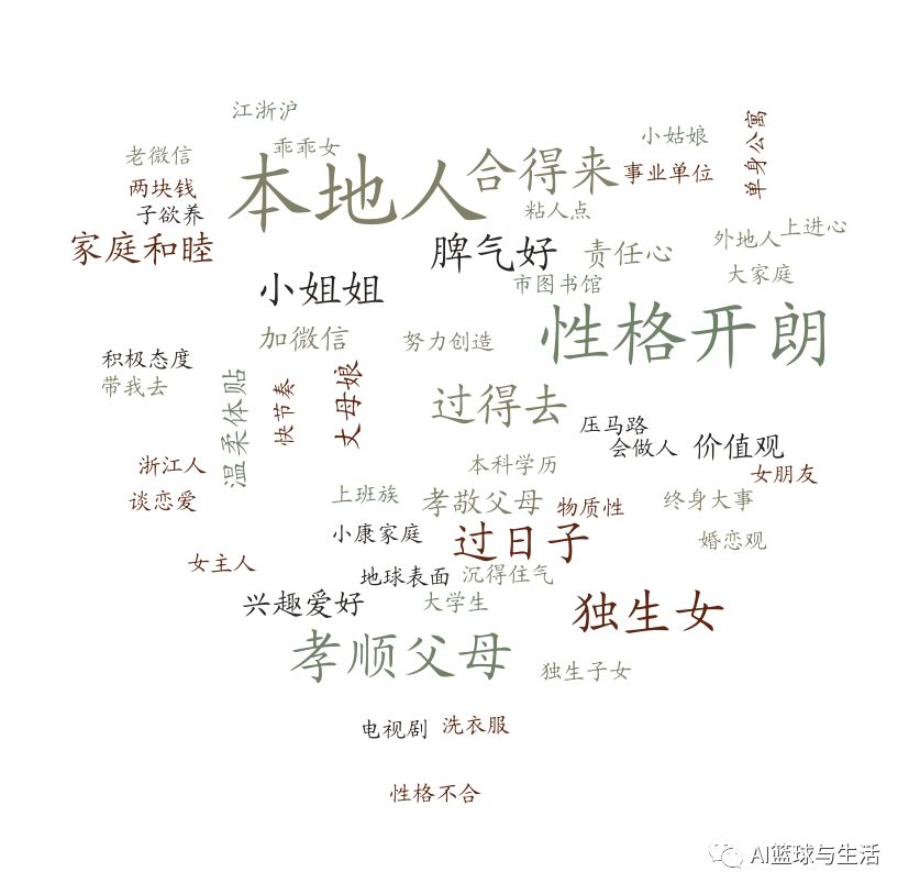 而从择偶标准来分析的话,从男性对另一半的期许,以及女性对另一半的期许,小编统计了相关的词频,并用wordcloud画了词云图,如下图所示