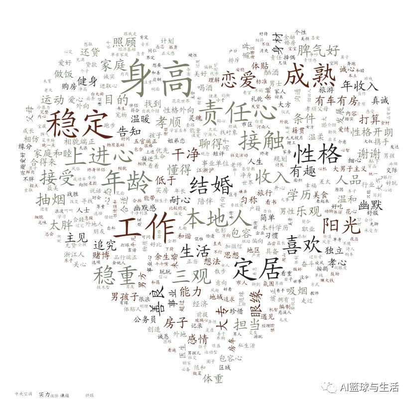 从上图可以看出来,女性对自己的另一半的期望主要有,希望他具备责任心和上进心,成熟稳重并且脾气好等等,当然除此之外,收入、有房有车和身高这种硬性指标也在女性的考虑范围之内,不过女性最主要看重的还是另一半的品行和性格。