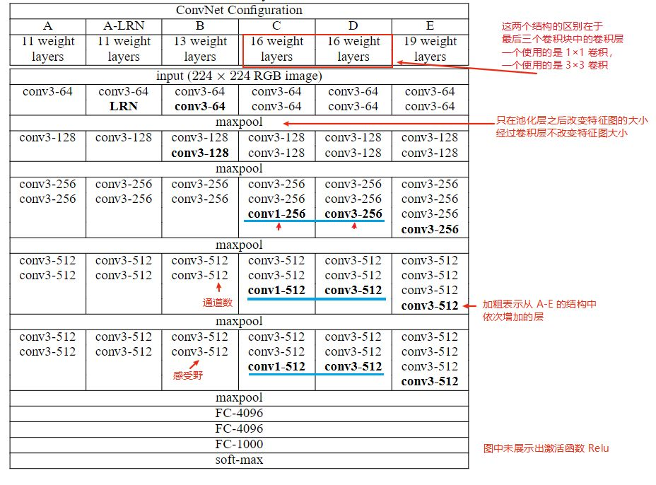 在《Very Deep Convolutional Networks for Large-Scale Image Recognition》论文中,作者给出了 6 个 VGG 模型,对应不同的网络结构和深度,具体结构如下: