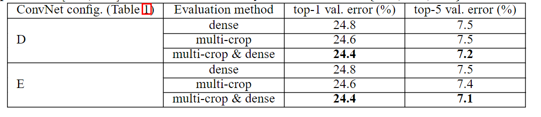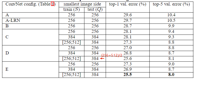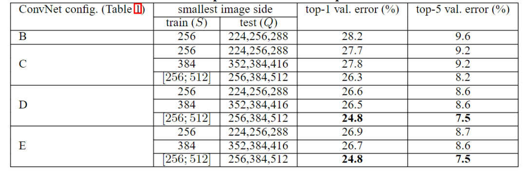 在单尺度上评估 ConvNet 模型后,我们现在评估测试时尺度抖动的影响。它包括在一张测试图像的几个归一化版本上运行模型(对应于不同的 Q 值),然后对所得到的类别后进行平均。考虑到训练和测试尺度之间的巨大差异会导致性能下降,用固定 S 训练的模型在三个测试图像尺度上进行了评估,接近于训练的尺度:Q = {S−32, S, S+32}。同时,训练时的尺度抖动允许网络在测试时应用于更广的尺度范围,所以用变量 S ∈ [Smin; Smax] 训练的模型在更大的尺寸范围 Q = {Smin, 0.5 (Smin + Smax), Smax} 上进行评估。
