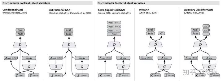 ACGAN 的一个好处是,判别器输出条件的设计使我们可以采用在其他数据集上预训练的模型进行前一学习,从而生成更清晰的图像减轻模式崩塌的问题。此外,如上图所示,还有其他类似的设计为 GAN 添加先验分布,例如 SemiGAN 和 InfoGAN 等,但大同小异。
