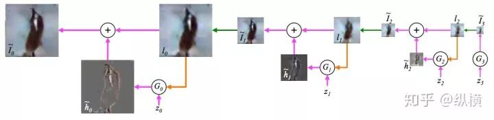 在训练过程中,LAPGAN 在每个分辨率下,以下采样后的图像为先验条件,学习下采样再上采样后与原图的信息损失,即残差的生成: