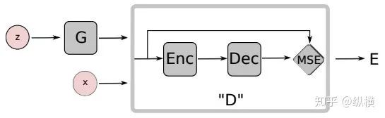 f-GAN 在散度视角集大成,EBGAN 则 将判别器视为一个能量函数,作为一个可训练的损失函数。该能量函数将靠近真实分布的区域视为低能量区域,远离真是分布的视为高能量区域。生成器会尽可能生成最小能量的伪造样本。在这种视角下,生成器的网络结构和损失函数更加灵活多变,EBGAN 提出 使用自动编码器结构,用重构误差代替分类器的分类结果 :