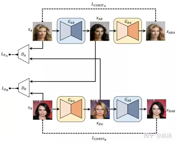 为了学习不同域之间的映射,DiscoGAN 首先想到了添加了第二个生成器,和重构损失项来比较真实图像和重构图像。