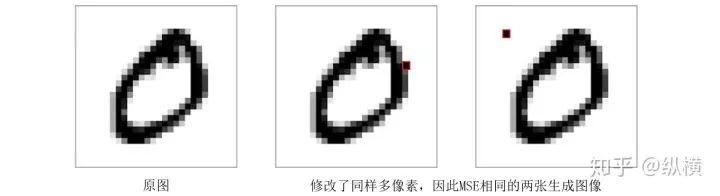 如上图所示,两张生成图像在原图的基础上修改的像素数目相同,因此其 MSE 误差相同。然而根据常识,第二张图像明显不符合 0 的模式。一个好的损失函数,应当赋予第二张生成图像更大的 MSE。