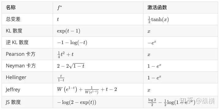 其中, 可以根据不同散度,替换为多种表达形式;由于 对判别器的值域有要求,判别器输出层的激活函数也需要替换: