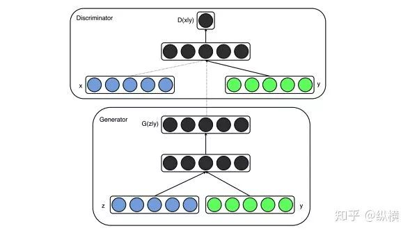 图中, 代表从正态分布中采样的噪声; 代表真实分布中采样的样本, 代表条件向量,例如样本标签的 one hot 编码。在判别器判别生成样本时,会根据条件判别,从而迫使生成器参考条件向量生成样本。