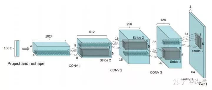 DCGAN 首次将 CNN 引入 GAN(此前 GAN 大多由全连接层构成),并提出了一个能够稳定收敛的 CNN + GAN 结构。很多 trick 为后面的研究提供了基础: