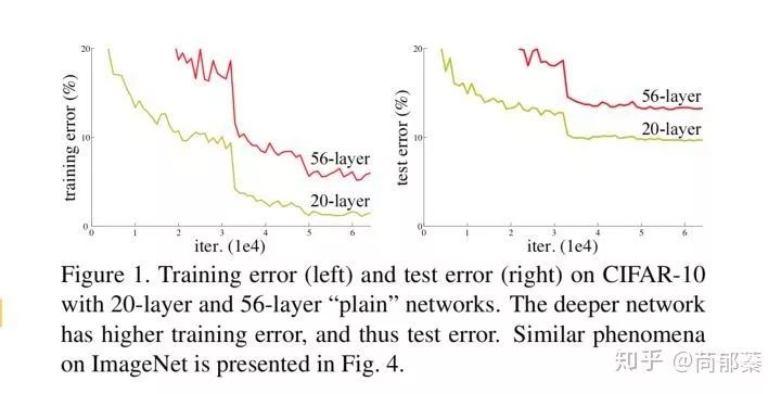 还不是所谓“最佳层数”,那么更深的网络就可以取得更好的结果。总而言之,与浅层网络相比,更深的网络的表现不应该更差。但是如下图所示,56层的神经网络表现明显要比20层的差。证明更深的网络在训练过程中的难度更大,因此作者提出了残差网络的思想。