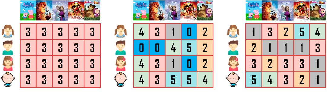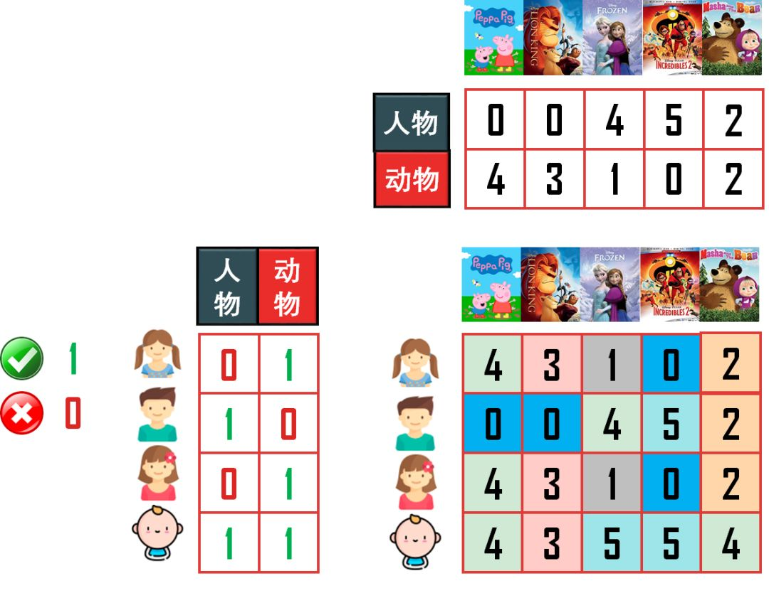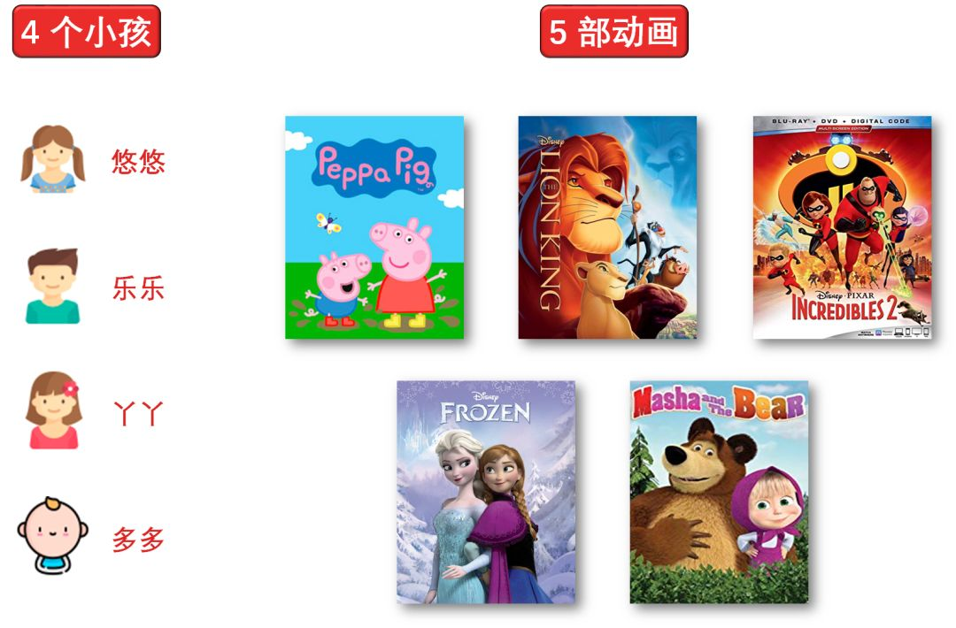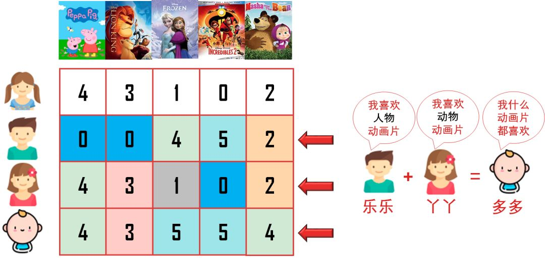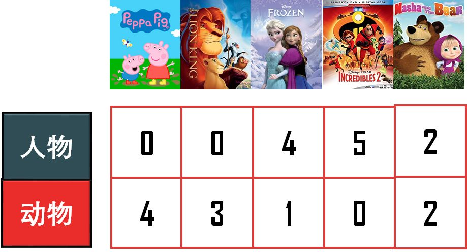 乐乐喜欢看带「人物」的动画,他给「冰雪奇缘」和「超人特工队」高分;丫丫喜欢看带「动物」的动画,她给「小猪佩奇」和「狮子王」高分;多多还比较小,只要是动画都喜欢,他给所有动画高分(多多给的分是乐乐和丫丫给的分之和)。