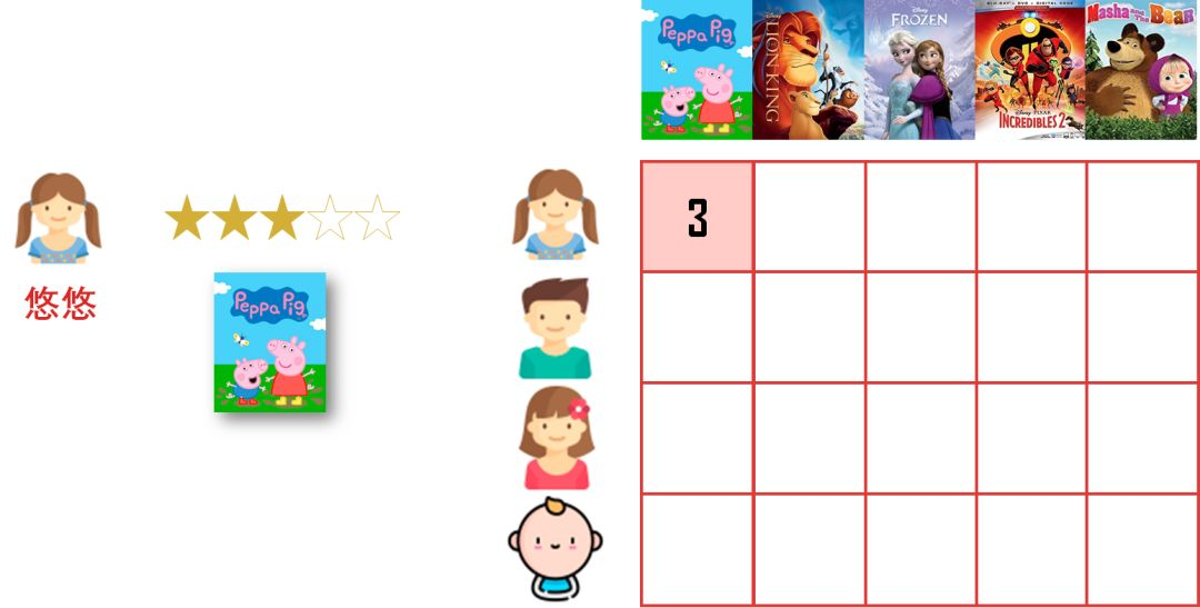 当悠悠给「小猪佩奇」打完分后,在矩阵第 1 行第 1 列填入 3 分。