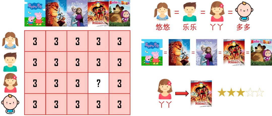 从评分矩阵来看,每个人对每个电影喜欢一样,因此预测出丫丫会给「超人特工队」打 3 分。