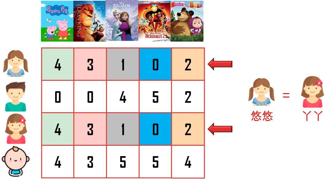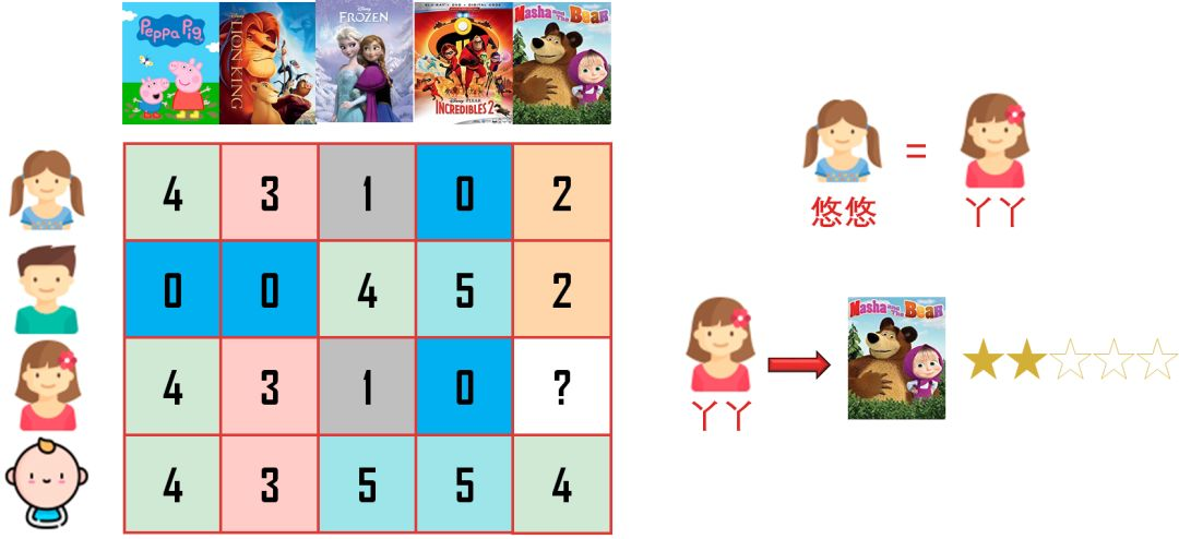 从评分矩阵第一行和第三行来看,悠悠和丫丫的喜欢相同,因此预测出丫丫会给「玛莎和熊」打 2 分,和悠悠一样。