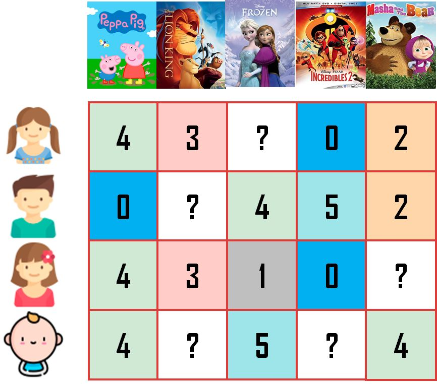 上面例子太简单,如果小孩有很多个,动画有很多部,我们怎么才能从评分矩阵中学到所有的规律呢?