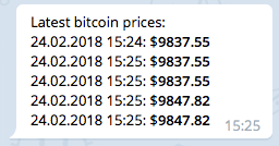 def main():bitcoin_history = []while True:price = get_latest_bitcoin_price()date = datetime.now()bitcoin_history.append({'date': date, 'price': price})# Send an emergency notificationif price < BITCOIN_PRICE_THRESHOLD:post_ifttt_webhook('bitcoin_price_emergency', price)# Send a Telegram notification# Once we have 5 items in our bitcoin_history send an updateif len(bitcoin_history) == 5:post_ifttt_webhook('bitcoin_price_update', format_bitcoin_history(bitcoin_history))# Reset the historybitcoin_history = []# Sleep for 5 minutes # (For testing purposes you can set it to a lower number)time.sleep(5 * 60)
