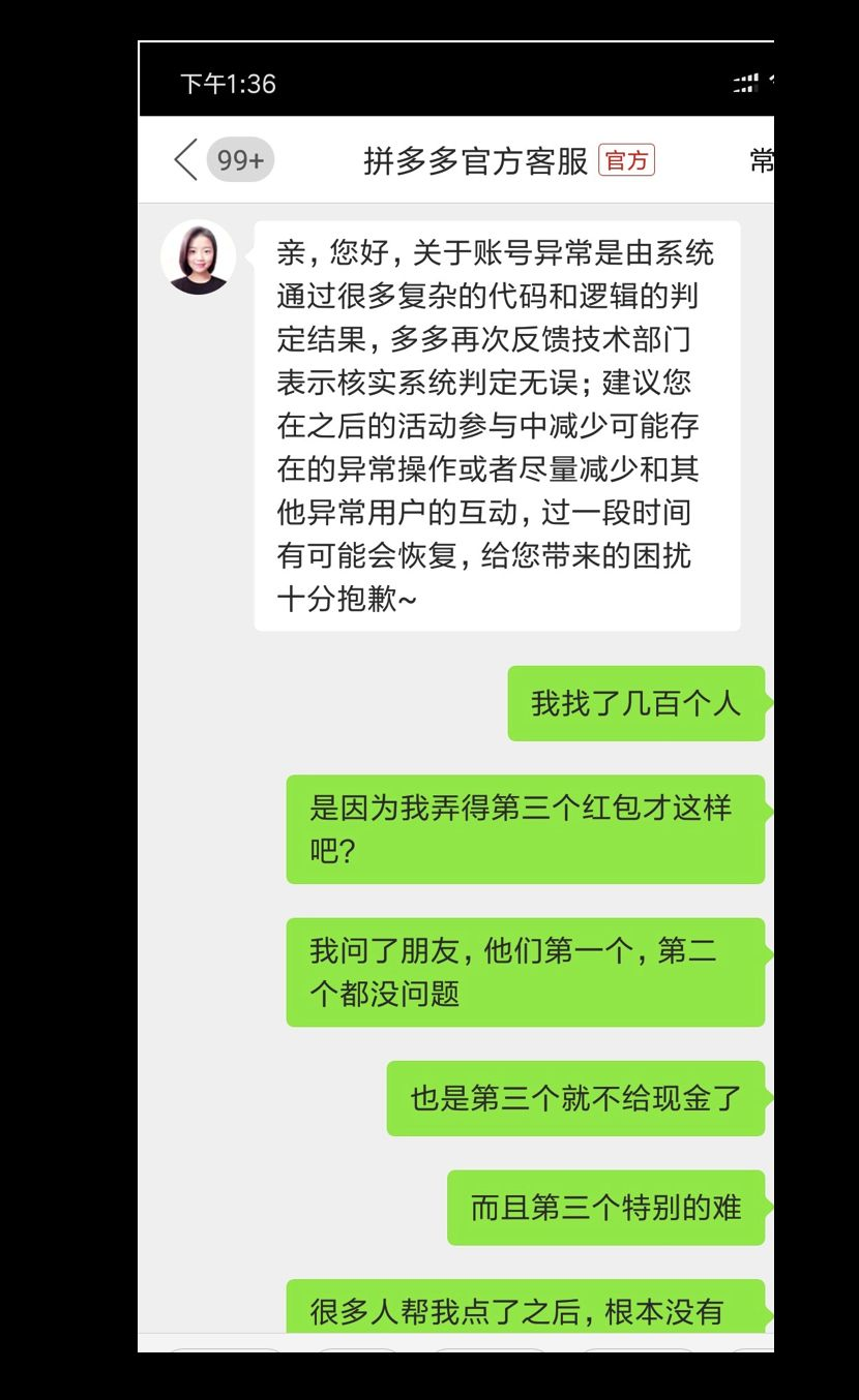 这时候愤怒的你找到拼多多的客服,质问凭什么别人都是直接打现金,而我却只有优惠卷?