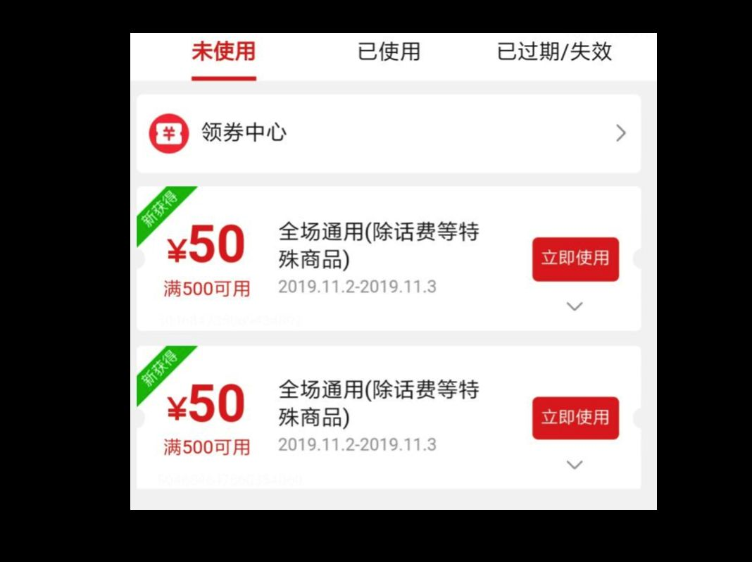 即使你耗尽所有社交信用,找到几百个人终于达到100元红包提现的时候,你却发现这个时候发给你的是100元的商品优惠卷,而且是两张满500减50。