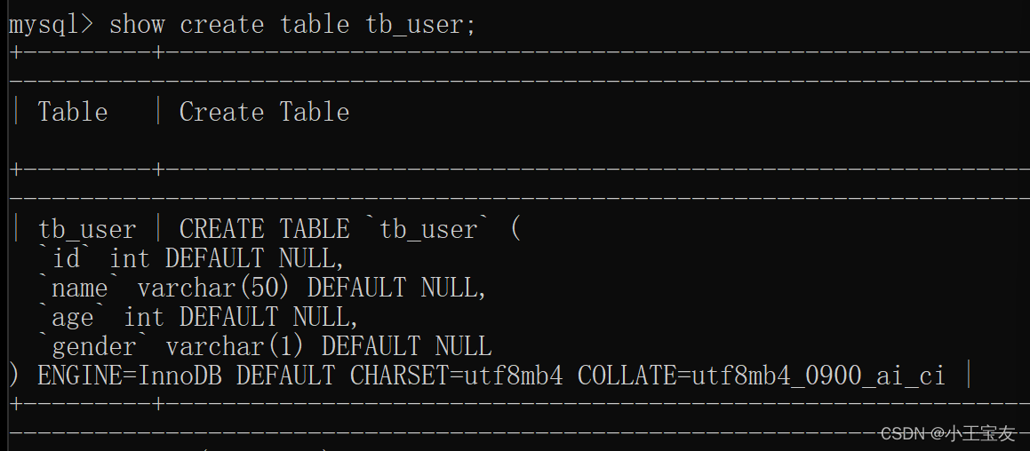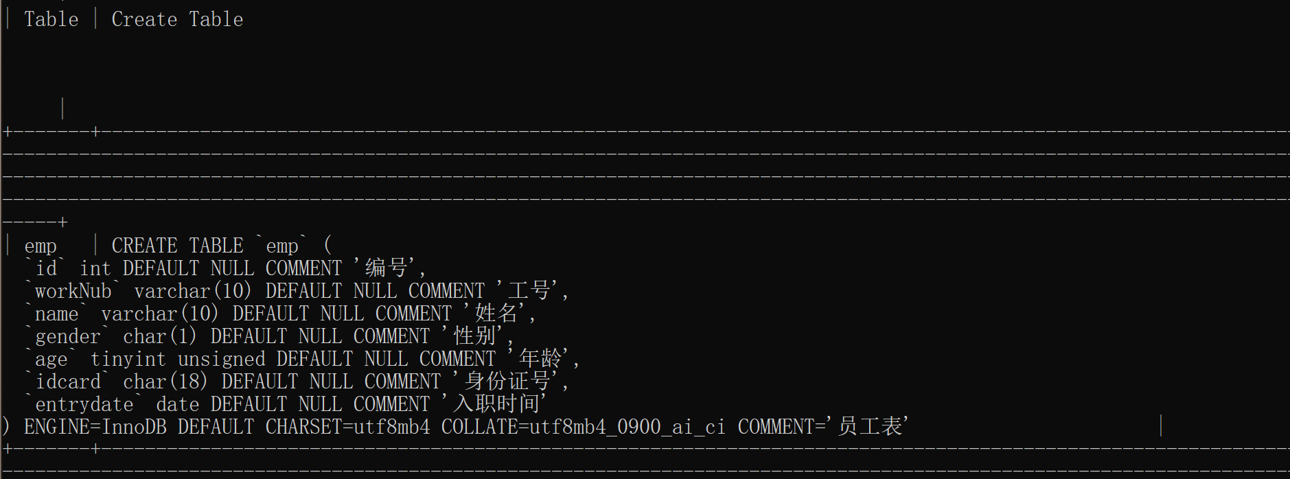 DEFAULT CHARSET=utf8mb4表格的数据编码格式COLLATE=utf8mb4_0900_ai_ci是表格的排序格式