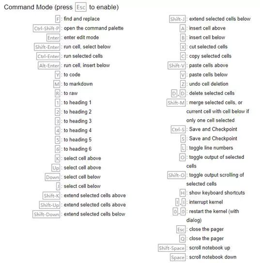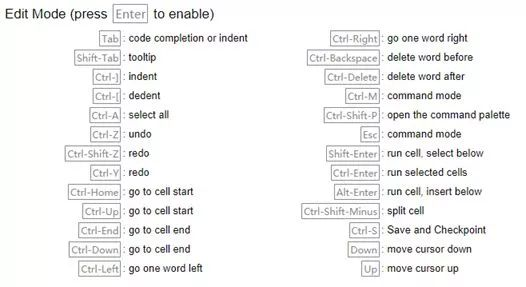 command mode和edit mode。在一个cell中按下enter就进入edit mode,按下Esc进入command mode。