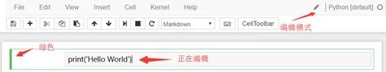 在命令模式(Command Mode)下,铅笔图标消失,单元左侧边框线呈现蓝色,按Enter键或者双击cell变为编辑状态。