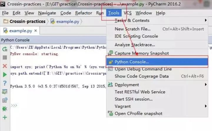 为了方便用户,Pycharm 提供了另一个贴心的功能,将 Python shell 直接集成在软件中,调出方法如下: