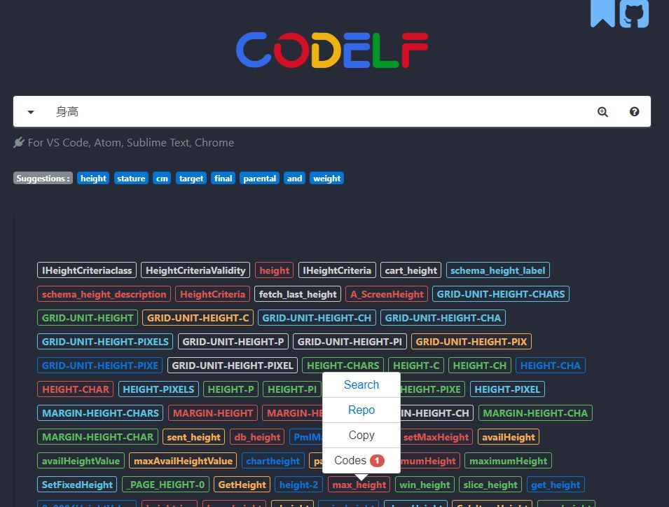 点击搜索后,网站会给出变量名的翻译,下方给出变量的起名建议,大家可以copy下变量名,也可以看下用了这个变量的源代码,而且可以选择开发语言种类。
