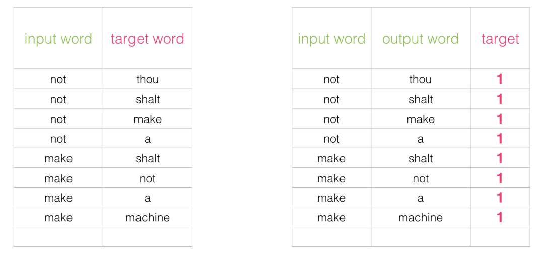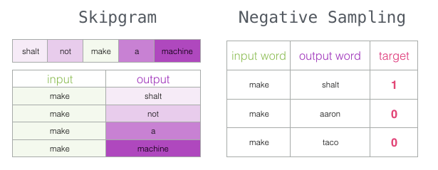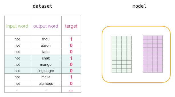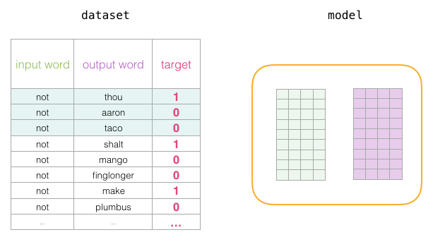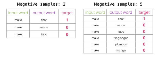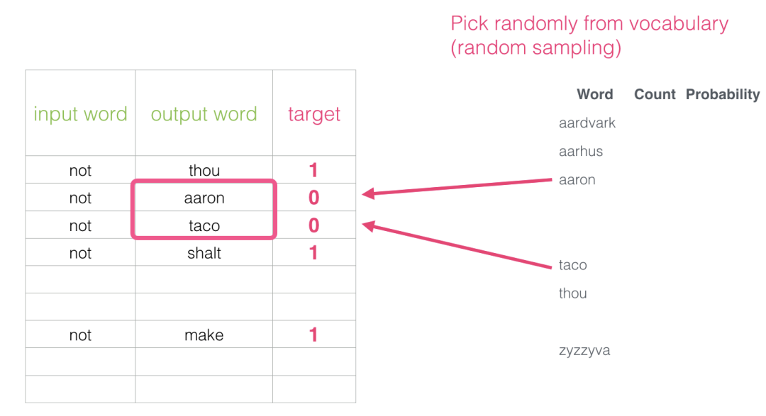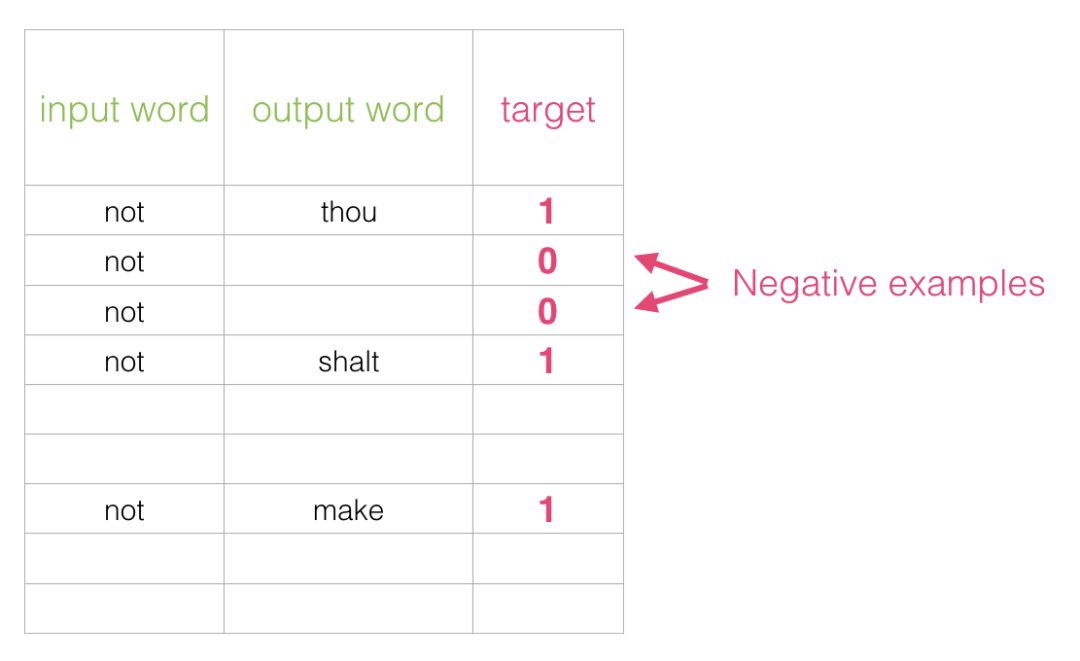 为了解决这个问题,我们需要在数据集中引入负样本 - 不是邻居的单词样本。我们的模型需要为这些样本返回0。现在这是一个挑战,模型必须努力解决,而且速度还要快。