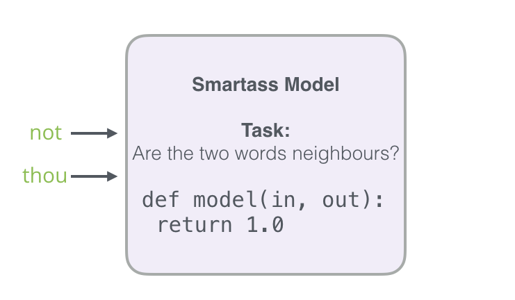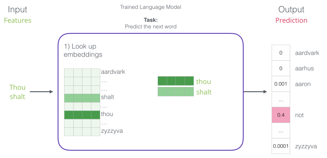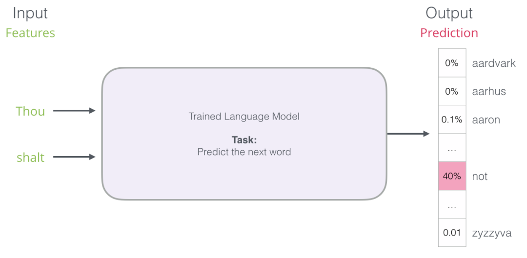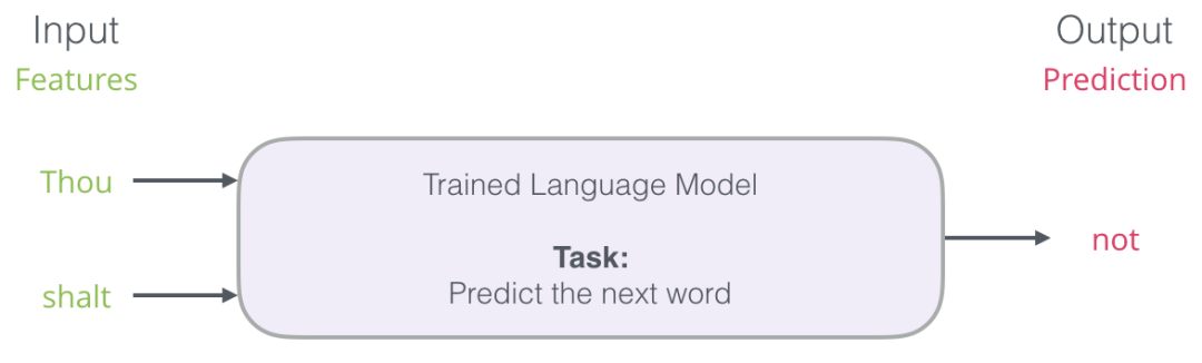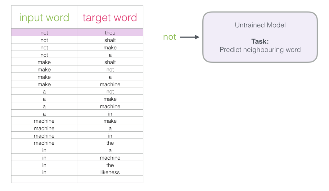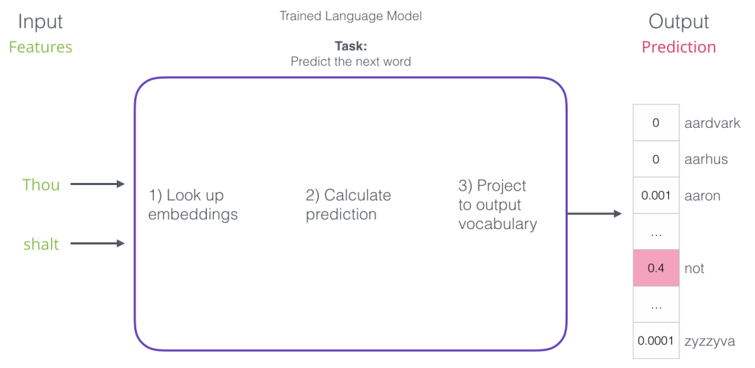 在上面的屏幕截图中,我们可以将模型视为接受这两个绿色单词(thou shalt)并返回建议列表(“not”是具有最高概率的那个字)的模型: