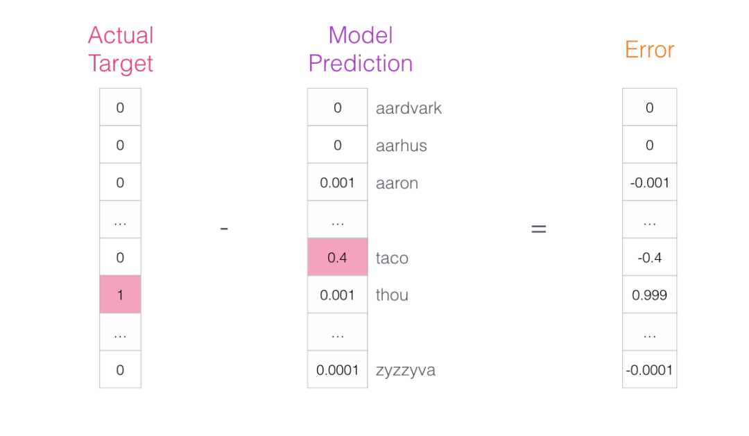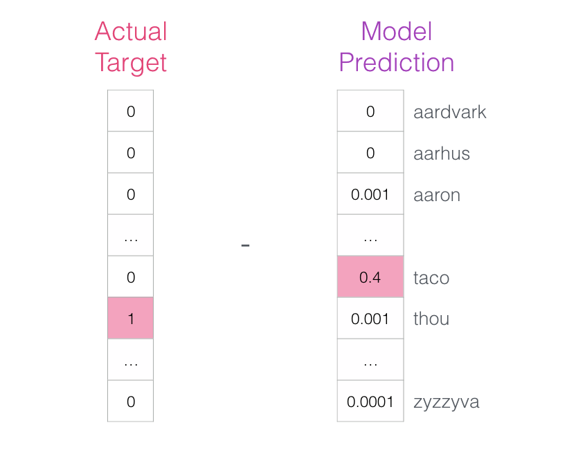 该模型进行三个步骤并输出预测向量(概率分配给其词汇表中的每个单词)。由于该模型未经过训练,因此在此阶段的预测肯定是错误的。但那没关系。我们知道应该它将猜到哪个词:我们目前用于训练模型的行中的标签/输出单元格: