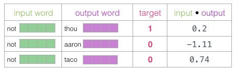 在训练过程开始时,我们用随机值初始化这些矩阵。然后我们开始训练过程。在每个训练步骤中,我们采取一个正样本及其相关的负样本。我们来看看我们的第一组: