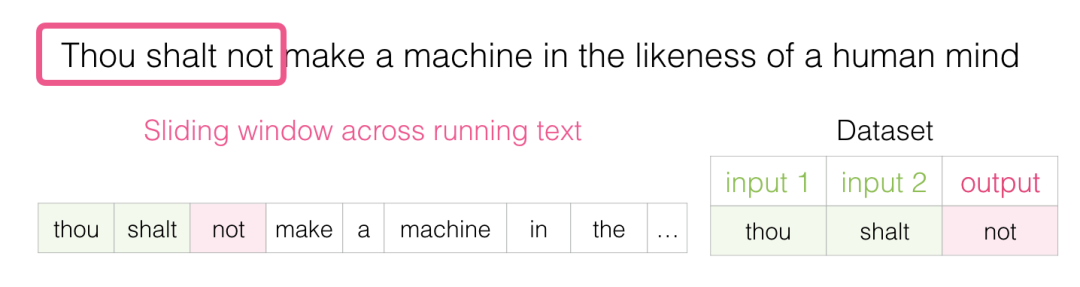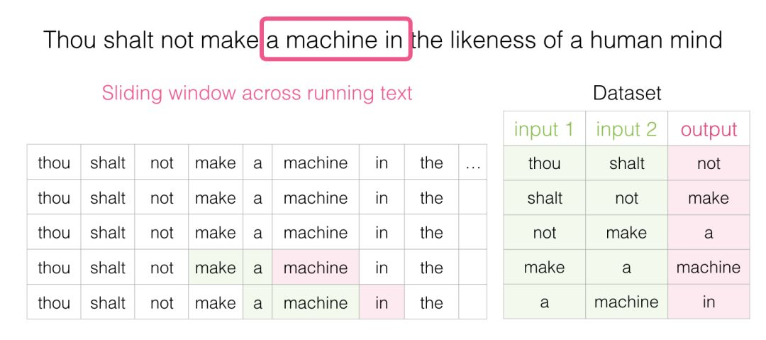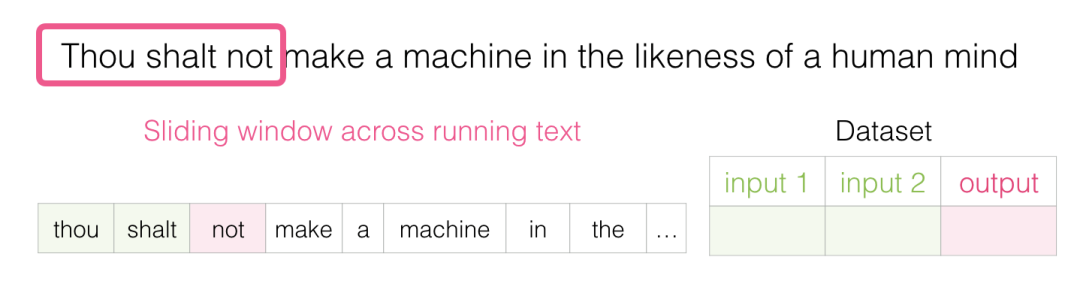 当这个窗口滑动文本时,我们(虚拟地)生成一个用于训练模型的数据集。为了准确看看它是如何完成的,让我们看看滑动窗口如何处理这个短语: