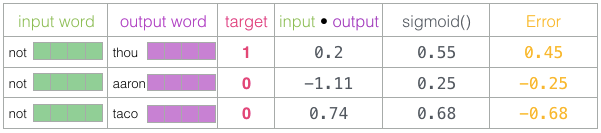 训练步骤到此结束。我们从这一步骤中得到稍微好一点的嵌入(`not`,`thou`,`aaron`和`taco`)。我们现在进行下一步(下一个正样本及其相关的负样本),并再次执行相同的过程。