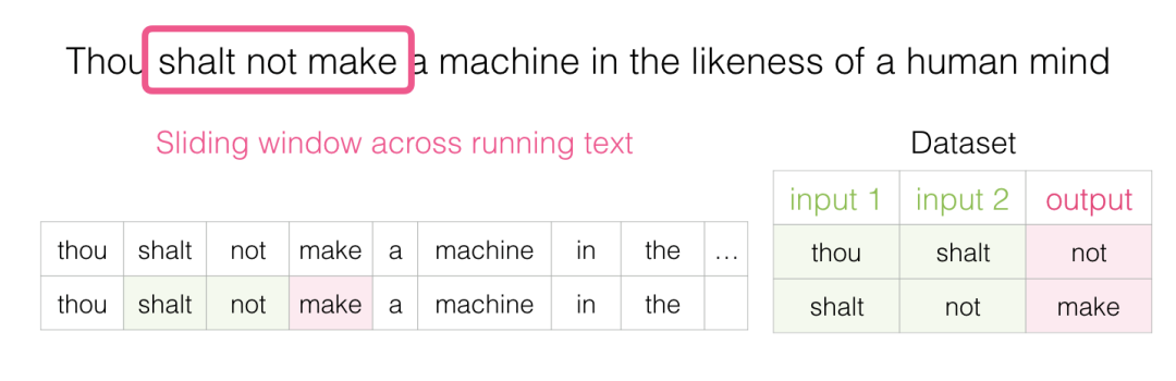 我们有一个窗口(比如说三个单词),我们会对所有文本进行滑动。