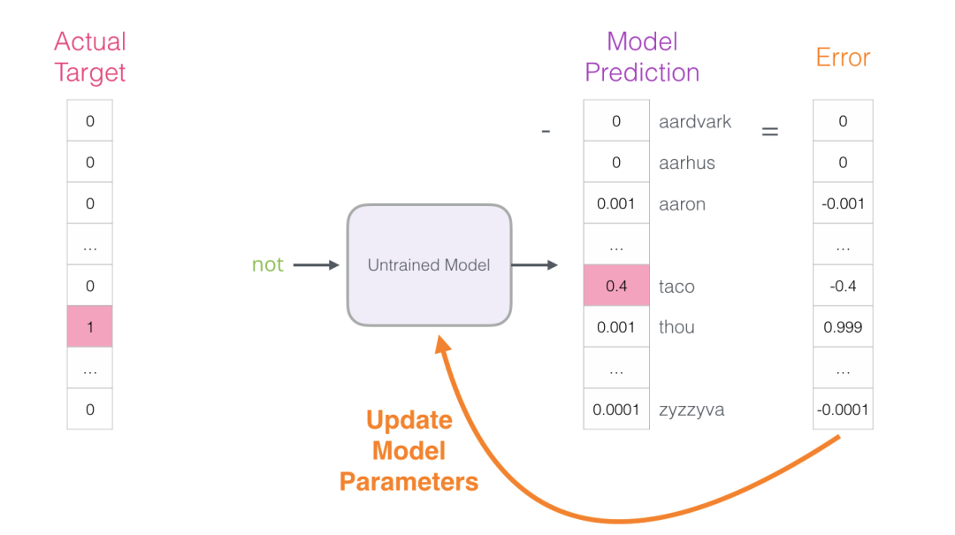 现在可以使用此误差向量来更新模型,以便下次当“not”作为输入时,模型更有可能猜测“thou”。