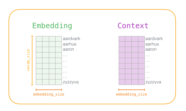 在训练过程开始之前,我们预先处理我们正在训练模型的文本。在这一步中,我们确定词汇量的大小(我们称之为vocab_size,比如说,将其视为10,000)以及哪些词属于它。在训练阶段的开始,我们创建两个矩阵 - Embedding矩阵和Context矩阵。这两个矩阵在我们的词汇表中嵌入了每个单词(这vocab_size是他们的维度之一)。第二个维度是我们希望每次嵌入的时间长度(embedding_size- 300是一个常见值,但我们在本文前面的例子是50。)。