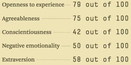 五大人格特质测试,这些测试会问你一个问题列表,然后在很多方面给你打分,内向/外向就是其中之一。