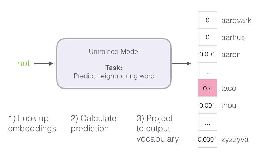 我们从数据集中的第一个样本开始。我们把特征提供给未经训练的模型,要求它预测一个合适的相邻单词。