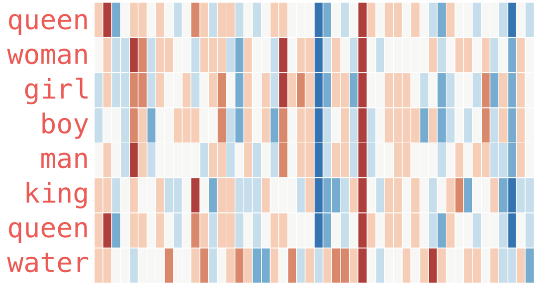 所有这些不同的单词都有一个直的红色列。它们在这个维度上是相似的(我们不知道每个维度代码是什么)