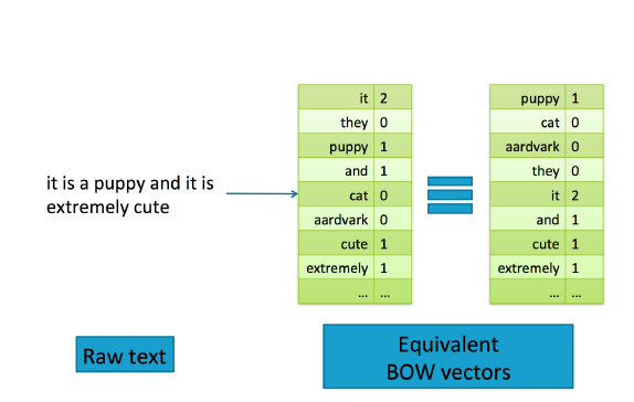 BOW 将文本文档转换为平面向量。它是“平面的”,因为它不包含任何原始的文本结构。原文是一系列词语。但是词袋向量并没有序列;它只是记得每个单词在文本中出现多少次。它不代表任何词层次结构的概念。例如,“动物”的概念包括“狗”,“猫”,“乌鸦”等。但是在一个词袋表示中,这些词都是矢量的相同元素。图 3-2 两个等效的词向量,向量中单词的排序不重要,只要它在数据集中的个数和文档中出现数量是一致的。