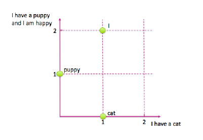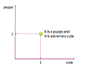 重要的是特征空间中数据的几何形状。在一个词袋矢量中,每个单词成为矢量的一个维度。如果词汇表中有 n 个单词,则文档将成为n维空间中的一个点。很难想象二维或三维以外的任何物体的几何形状,所以我们必须使用我们的想象力。图3-3显示了我们的例句在对应于“小狗”和“可爱”两个维度的特征空间中的样子。