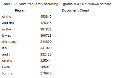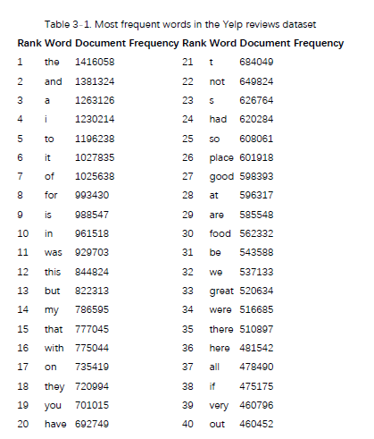 表 3-1 列出了 Yelp 评论数据集中最常用的 40 个单词。在这里,频率被认为是它们出现在文件(评论)中的数量,而不是它们在文件中的数量。正如我们所看到的,该列表涵盖了许多停用词。它也包含一些惊喜。"s"和"t"在列表中,因为我们使用撇号作为标记化分隔符,并且诸如"Mary's"或"did not"之类的词被解析为"Mary s"和"didn t"。词"good","food"和"great"分别出现在三分之一的评论中。但我们可能希望保留它们,因为它们对于情感分析或业务分类非常有用。最常用的单词最可以揭示问题,并突出显示通常有用的单词通常在该语料库中曾出现过多次。例如,纽约时报语料库中最常见的词是“时代”。实际上,它有助于将基于频率的过滤与停用词列表结合起来。还有一个棘手的问题,即何处放置截止点。不幸的是这里没有统一的答案。在大多数情况下截断还需手动确定,并且在数据集改变时可能需要重新检查。