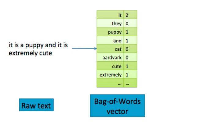 在词袋特征中,文本文档被转换成向量。(向量只是 n 个数字的集合。)向量包含词汇表中每个单词可能出现的数目。如果单词"aardvark"在文档中出现三次,则该特征向量在与该单词对应的位置上的计数为 3。如果词汇表中的单词没有出现在文档中,则计数为零。例如,“这是一只小狗,它是非常可爱”的句子具有如图所示的 BOW 表示图 3-1 转换词成向量描述图